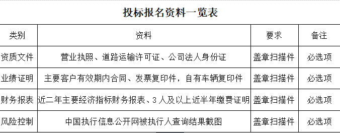 3、递交标书时间:已领取招标资料(免费)符合条件参与后续投标物流企业三个工作日内以邮寄和现场投递方式提供,一式三份(一正二副),必须密封。(标书以书面形式和电子版-EXCEL格式U盘载体形式同时提供,所有纸质版资料需加盖骑缝章,标书组成内容要求参见招标单位提供的招标资料)。
