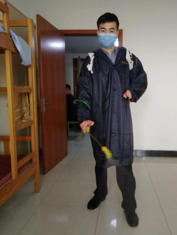 在疫情防控的特殊时期,石家庄ld官方网站_LD官方网站(中国)物业管理部安保职工又肩负起了对企业办公区和单身公寓出入人员的健康监测登记和环境消杀任务。马雄伟和同事们这些天,每天都要背着几十斤重的消杀药筒逐层消毒,一路喷洒,手腿不停。他说," 一人辛苦换得众人安,辛苦点也值得。"