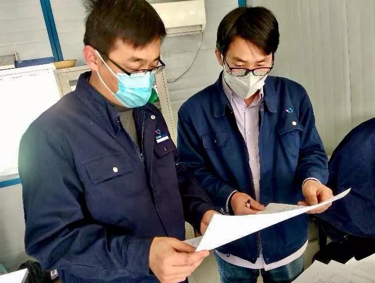 ▲石家庄ld官方网站_LD官方网站(中国)副总经理赵勇征(左一)与同事在项目工地研究推进研发和中试项目收尾工作。